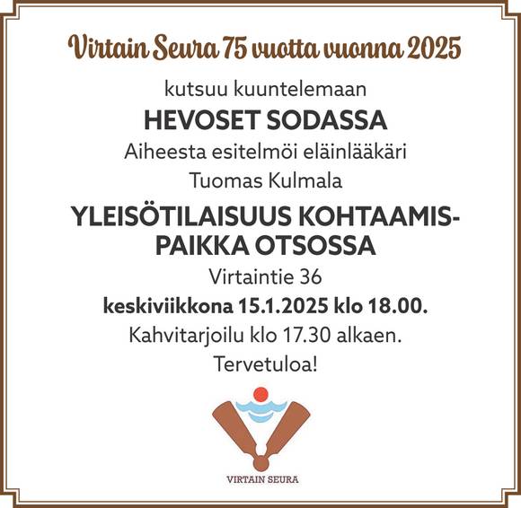 Tarkempi ohjelma ilmoitetaan myöhemmin. Tervetuloa! Järj. Virtain Seura ry.